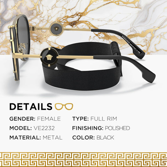 Versace VE2232 61mm Non-Polarized Aviator Sunglasses for Women – Black Metal Frame with Gold Temples, 100% UV Protection, Lightweight & Comfortable Sunglasses, eShades Eyewear Kit Included